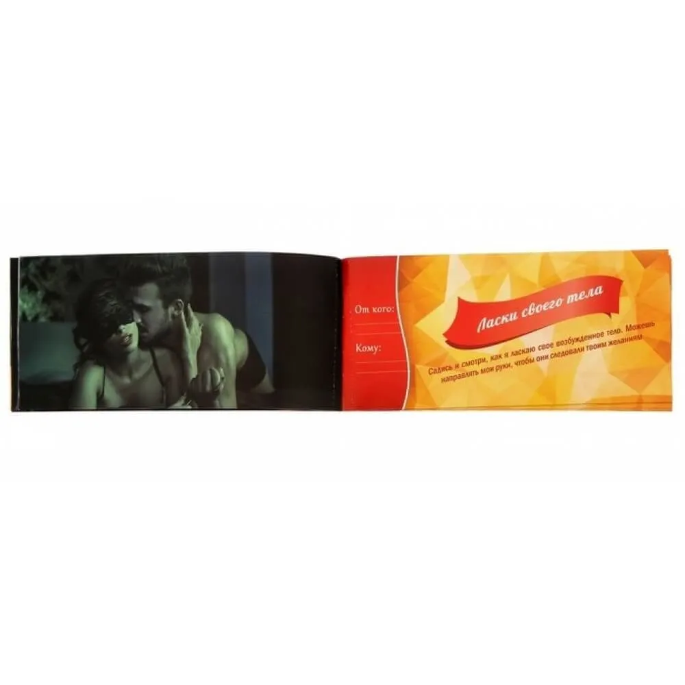 В наборе Вы найдёте 20 купонов для любимого мужчины. Он оторвёт любую понравившуюся карточку и вручит её Вам для исполнения.