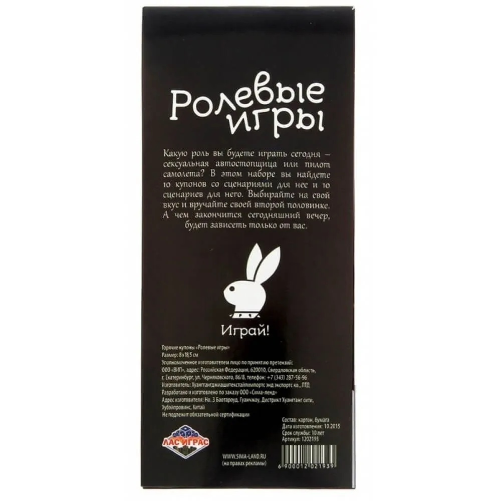 Купоны "Ролевые игры" от компании Сима Ленд дадут Вам множество идей для проведения незабываемого вечера и помогут полностью преобразиться! Выберите купон с понравившимся сценарием и вручите его своему партнеру, чтобы он помог всем Вашим тайным фантазиям осуществиться. В комплекте Вы найдете 20 купонов для него и для нее с описанием различных сценариев ролевых игр, которые вам вдвоем предстоит исполнить. Выбирайте любой понравившийся план событий и дарите друг другу страстное наслаждение!