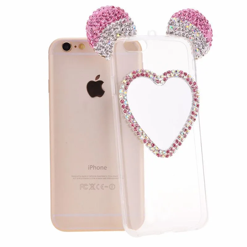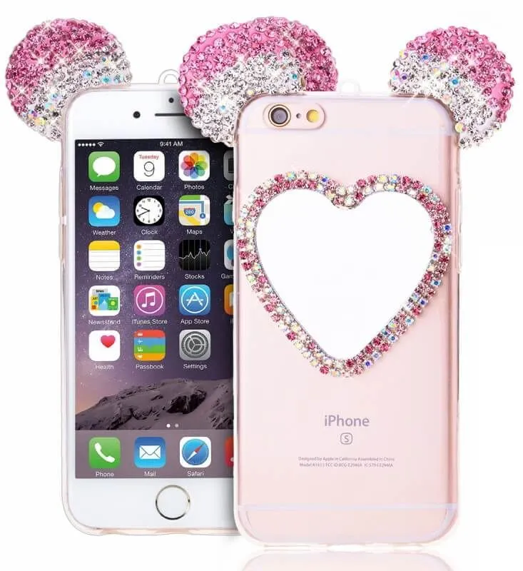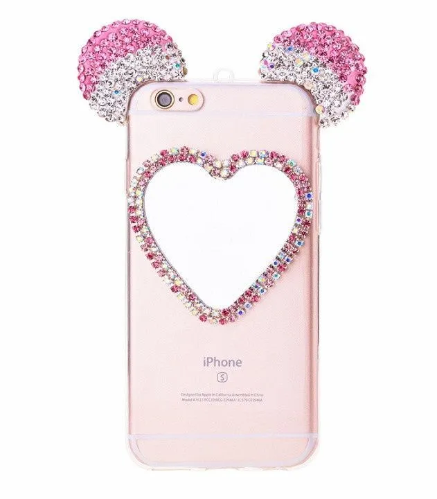 Очень милый чехол для iPhone 6/6S украсит собой Ваш телефон, буквально превратив его в сияющую драгоценность. Ушки мышки с переливающимися стразами будут ярко сверкать на свету, привлекая внимание. Сзади на чехле есть зеркальце в виде сердечка, также украшенное стразами, в которое в любой момент можно будет посмотреться, чтобы проверить макияж или просто полюбоваться собой.