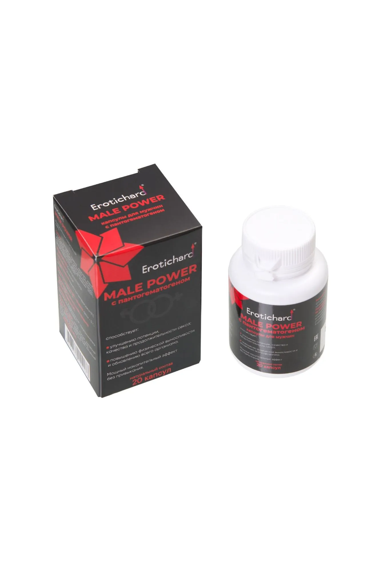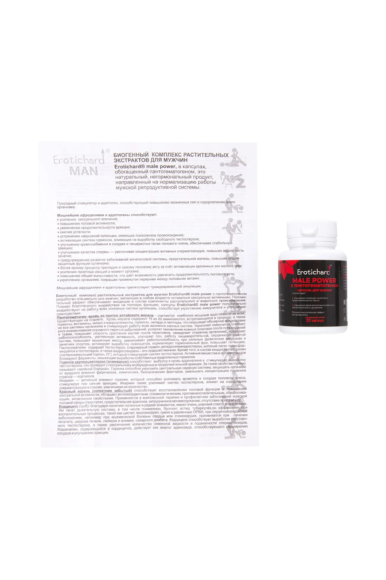 Биогенный комплекс растительных экстрактов Erotichard® male power в капсулах с пантогематогеном – это натуральный, негормональный продукт, направленный на нормализацию работы мужской репродуктивной системы.