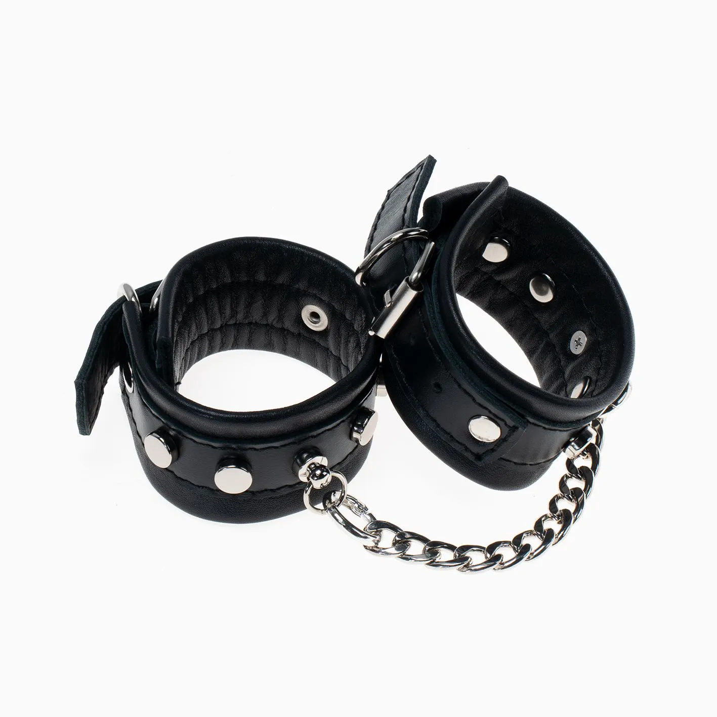 Наручники сделаны из кожи и декорированы металлическими заклёпками. Они соединены между собой металлической цепочкой на карабинах. Наручники регулируются по размеру ремешками с пряжками.