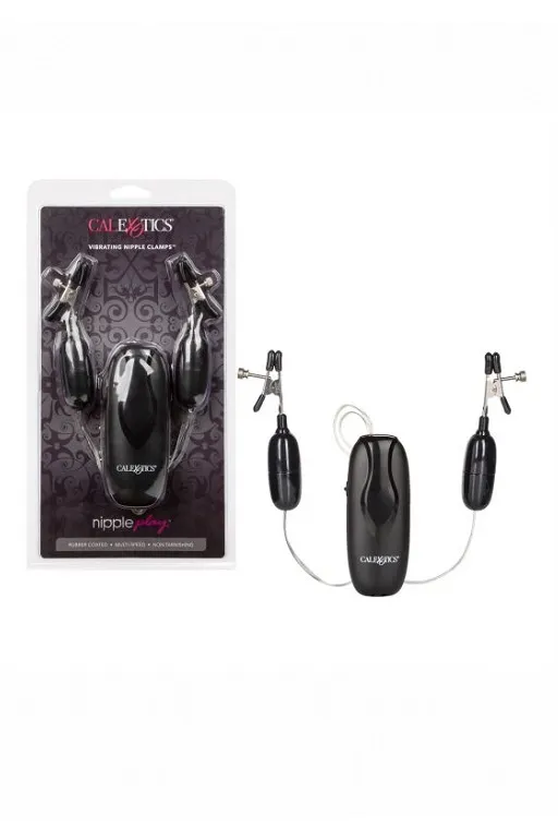 Vibrating Nipple Clamps - регулируемые зажимы на соски в виде прищепок с утяжелением и c вибрацией. Они изготовлены из несодержащего никеля железа. Кончики зажимов оснащены мягкими, удобными подушечками из ПВХ. Подвески и пульт управления изготовлены из несодержащего фталатов АБС-пластика.