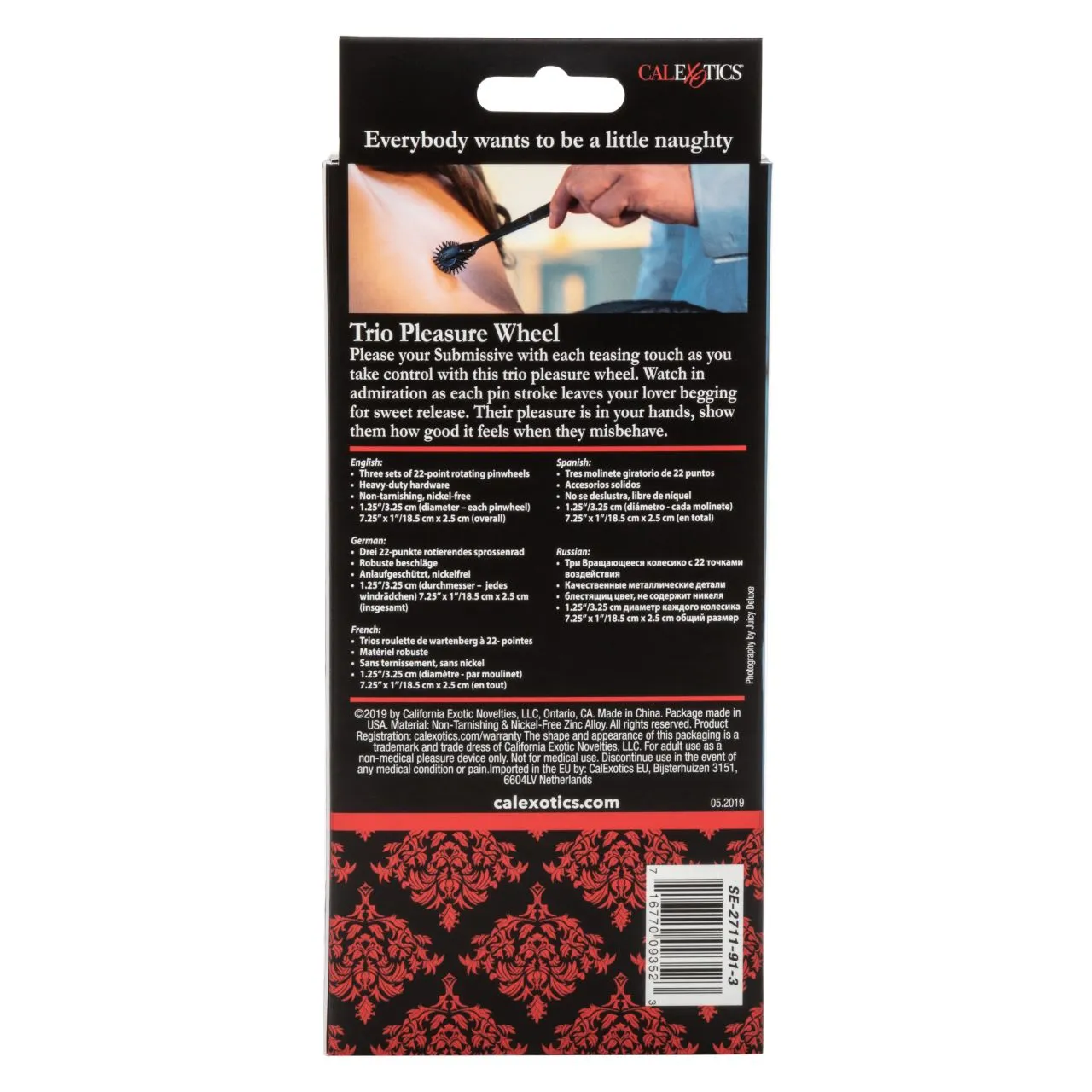 Колесо вартенберга Scandal Trio Pleasure Wheel – аксессуар для эротических ролевых игр и БДСМ практик. Представляет собой три массажных колесика, на которых располагаются 22 тонких шипа средней длины. Шипы обеспечивают покалывающие ощущения, которые напоминают легкие уколы иголки, касающейся кожи. Аксессуар изготовлен из сверхпрочного, не тускнеющего сплава.