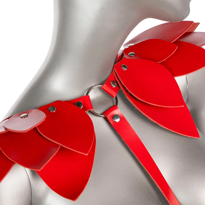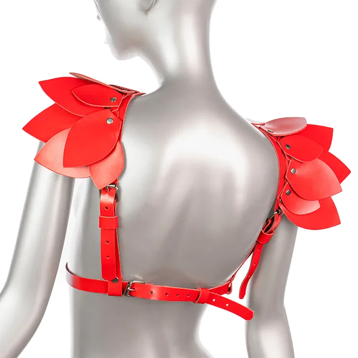 Ярко-красная кожаная портупея с крылышками на плечах - выразительный и привлекающий внимание аксессуар. Её можно носить в повседневной жизни, надевая поверх платья, рубашки или блузки. Или собрать идеальный кокетливый образ на тематическую или любую другую вечеринку. Все взгляды будет обращены на вас.