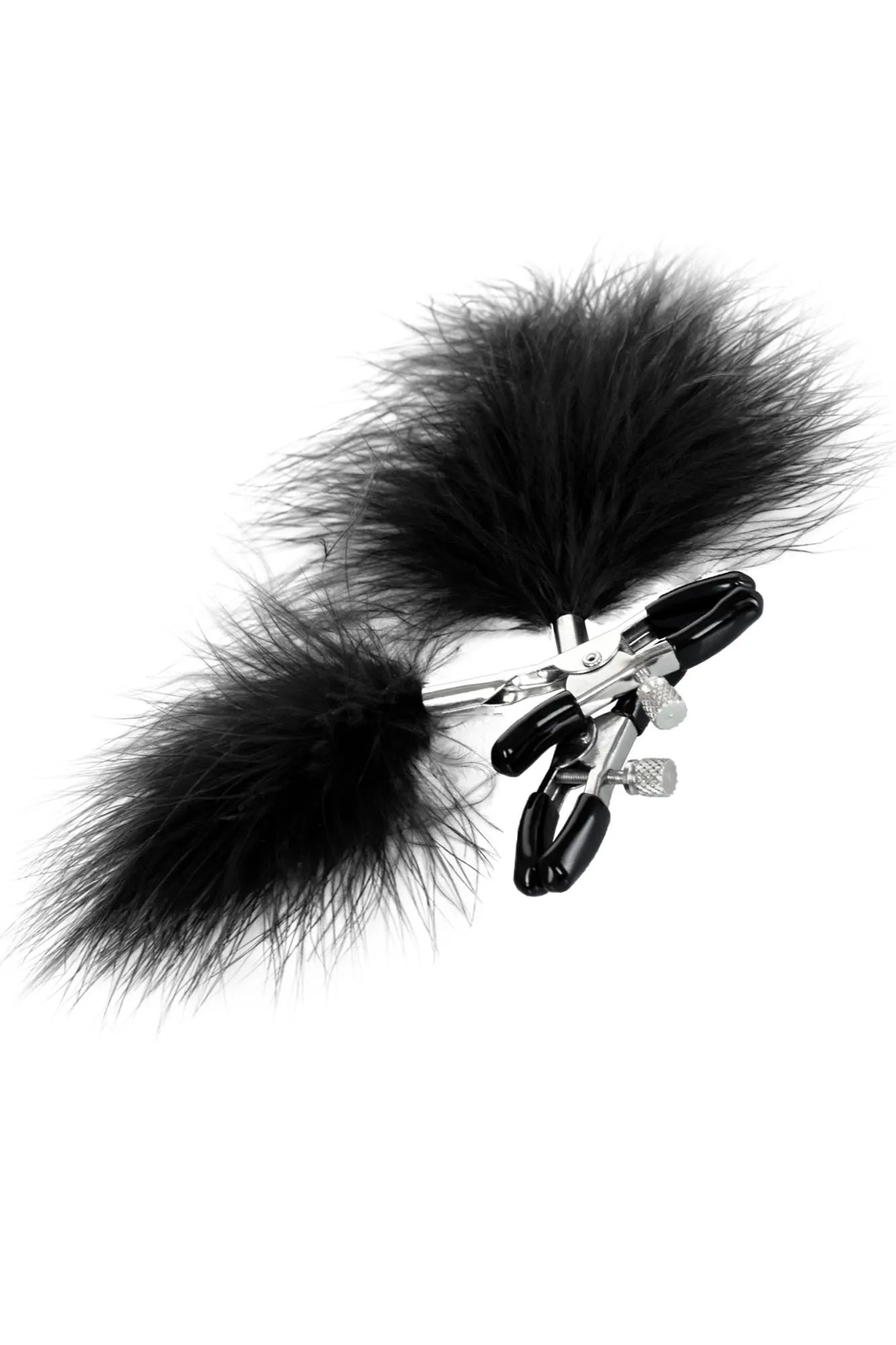 Пожалуй, самые милые из всех зажимов - украшенные перьями. Они стимулируют не только сжатием сосков, но и щекочут грудь. Сдавливание регулируется болтиком и может быть усилено или уменьшено во время интимной игры. Покрытие на концах зажимов защищает нежную кожу.