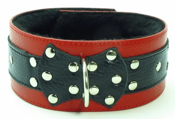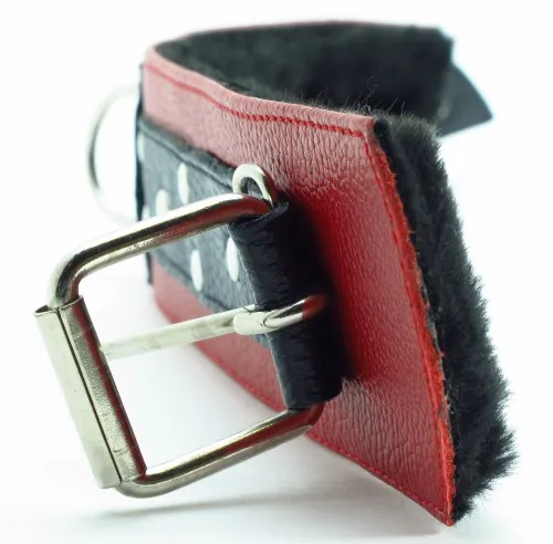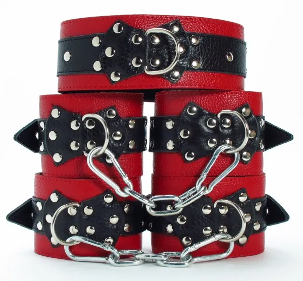 Набор аксессуаров, изготовленных из натуральной кожи. В него входят: наручники и поножи, украшенные заклепками (ширина - 6 см), которые можно соединять и комбинировать между собой при помощи цепей с карабинами (входят в комплект). Размер меняется при помощи застежки. Так же имеется черно-красный ошейник, шириной 5 см, с одним кольцом. Размер регулируется застежками. Все атрибуты имеют внутреннюю меховую подкладку для комфортного использования.