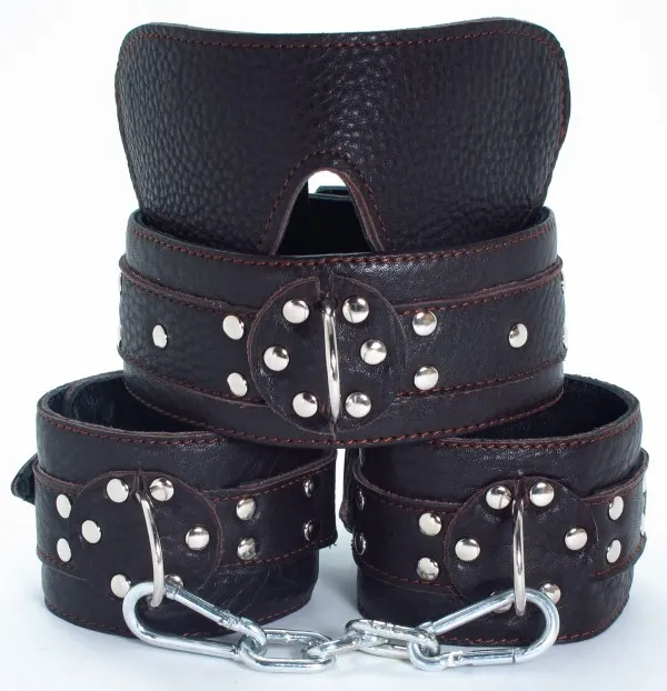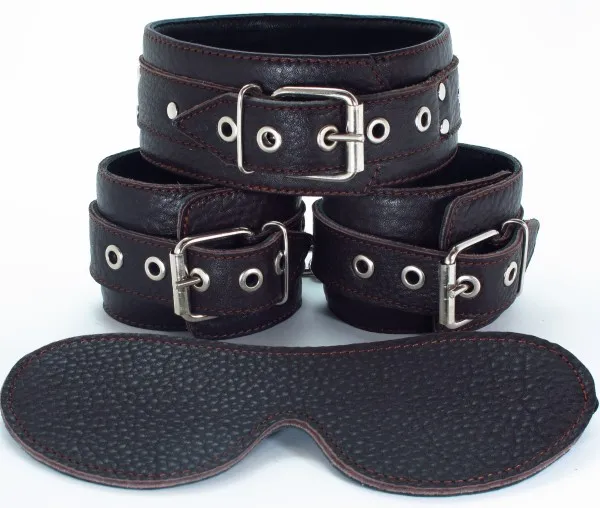 Стильный кожаный набор темно-коричневого цвета состоит из ошейника (ширина - 5 см), пары оков (ширина - 6 см) и маски на глаза. Все детали легко соединяются между собой при помощи карабинов, размер ошейника и оков регулируется при помощи застежки
