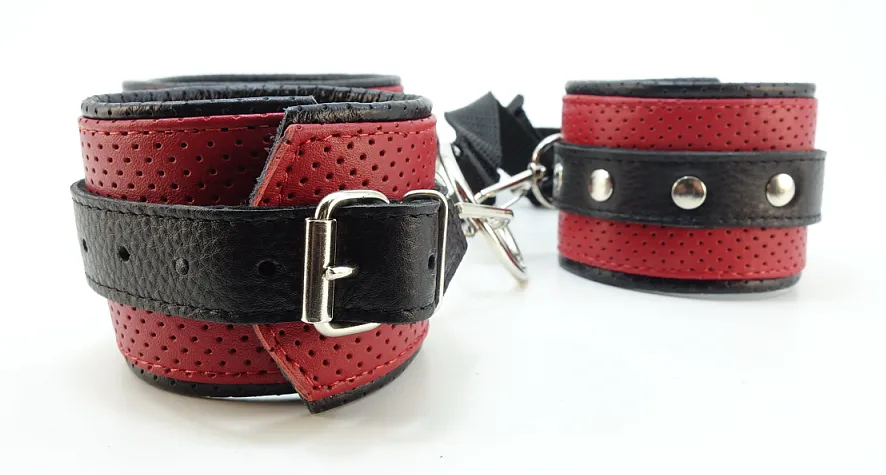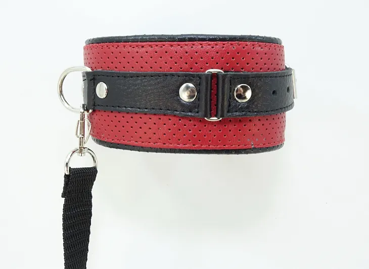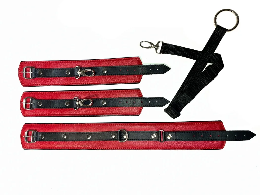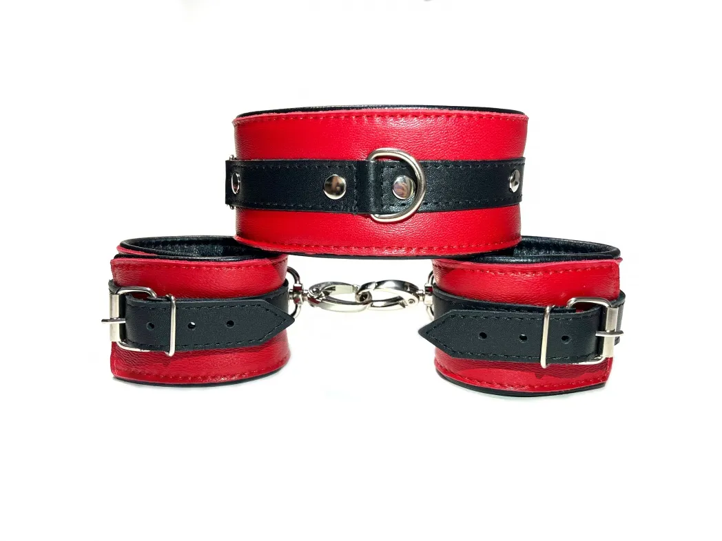 Набор фиксаторов из ошейника, соединенного с наручниками с помощью ремешка из ранцевой ленты. Полностью выполнен из натуральной овечьей кожи: верхний слой красного цвета, а подклад - чёрного. Благодаря такому сочетанию материала, этот набор невероятно комфортен в использовании, нежнейшая кожа подарит самые приятные ощущения Ширина аксессуаров 5,5см, ширина ремешков 2см. Ошейник подойдет на обхват от 28 до 36см, наручники на обхват от 13 до 22см. Длина ленты регулируется от 14 до 58см, на одном ее конце находится карабин для ошейника, а на другом кольцо для крепления наручников, ширина ленты 2см.