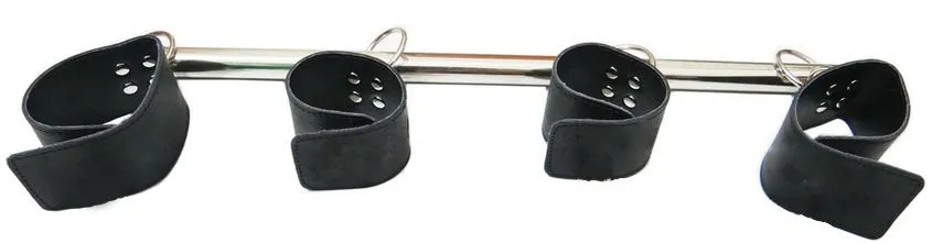 Металлическая штанга серебристго цвета. Длина - 80 см, по всей длине на одинаковом расстоянии друг от друга расположены крепления для рук и ног в виде оков. Оковы изготовлены из кожи, ширина -  5 см, уркашены заклекпами. Размер регулируется при помощи застежек-липучек. Оковы крепятся к штанге при помощи карабинов