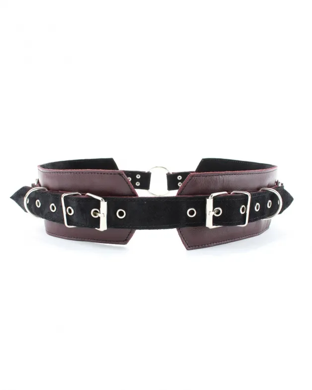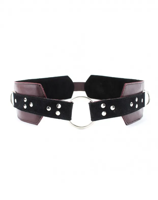Пояс выполнен  из натуральной кожи бордового цвета,  декорирован ремнями из черной замши, тремя металлическими кольцами  и четырьмя  полукольцами. Сзади аксессуар надежно фиксируется пряжкой, ремни позволяют  выбрать нужный размер. Мягкий подклад  из замши обеспечит комфортное пребывание . Аксессуар позволяет в полной мере насладиться  играми в стиле БДСМ.