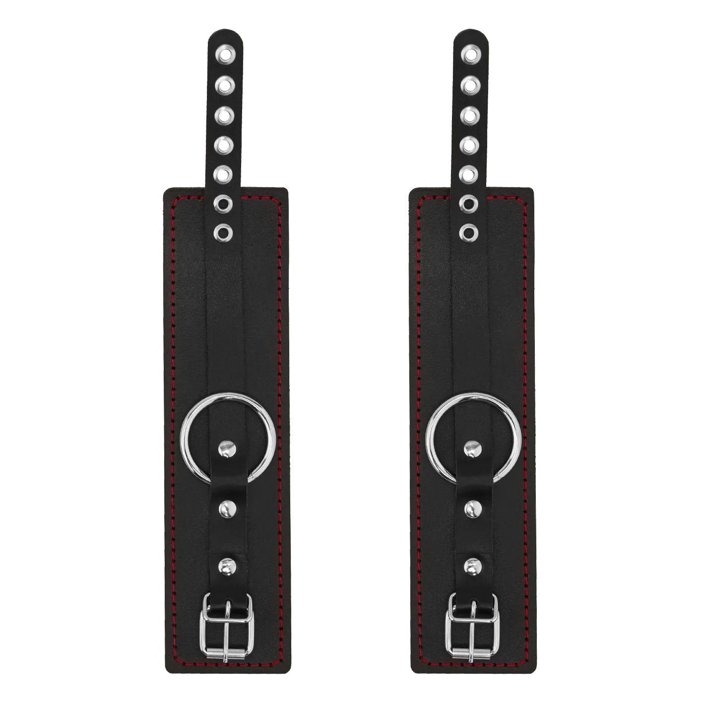 На каждом конце креста есть карабины, при помощи которых Вы сможете присоединить к ним наручники и поножи или же другие аксессуары. Однослойные наручники и оковы выполнены из натуральной кожи черного цвета и декорированы контрастной строчкой.