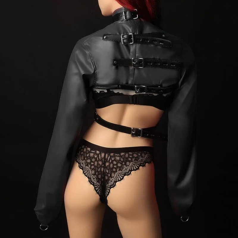 Бондажный комплект от бренда Lapin Rose позволит Вам обездвижить руки своей партнерши и зафиксировать их в нужном положении. На рукавах без отверстий для кистей есть небольшие полукольца, которые можно соединить между собой цепочкой или карабином (в комплект не входят). На ошейнике также есть полукольца более крупного размера, к которым можно присоединить другие бондажные аксессуары, чтобы разнообразить сценарии игры. Размер жакета регулируется при помощи ремешков с пряжками.