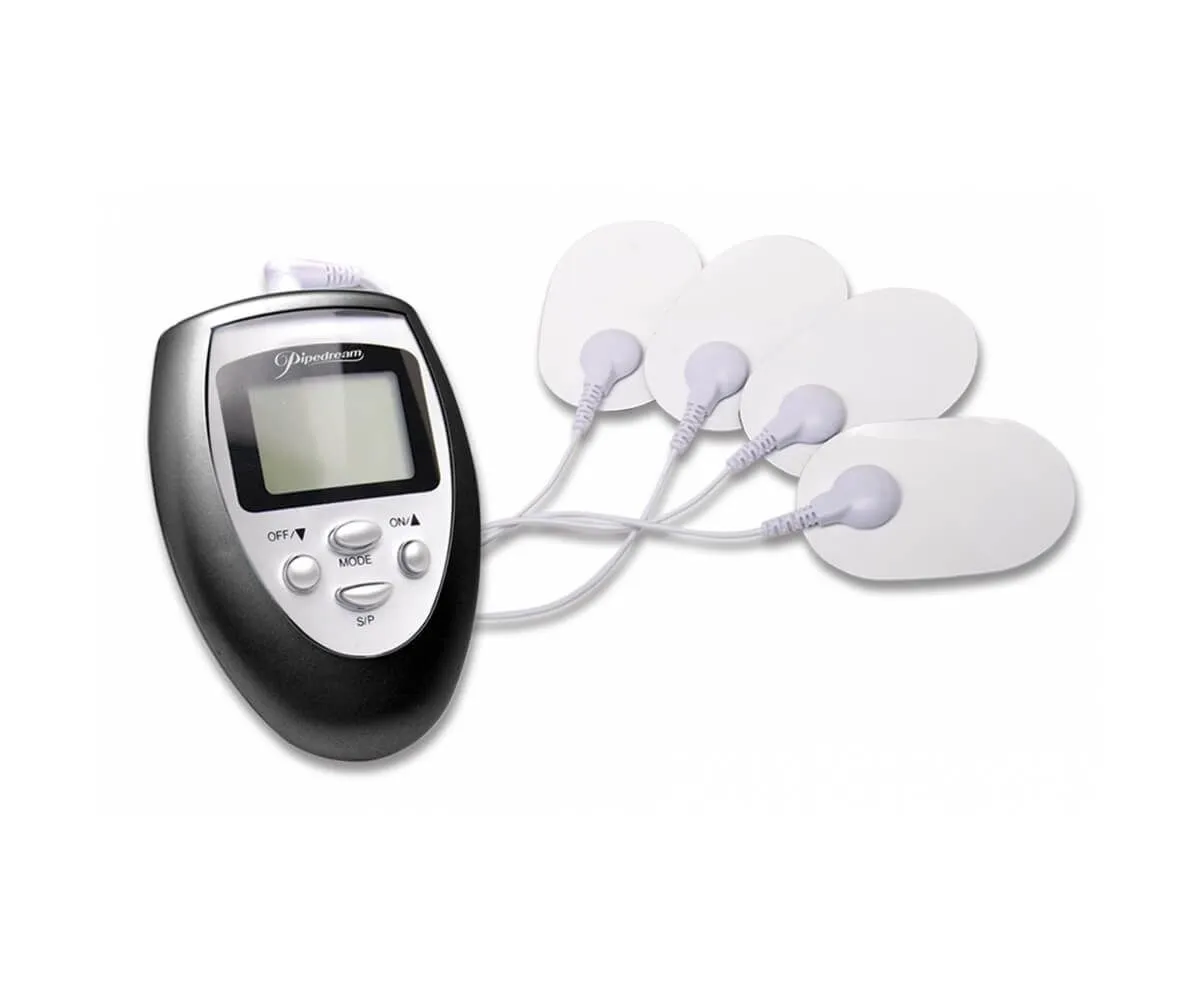 Shock Therapy от бренда Pipedream - это универсальный набор для электростимуляции. Многие уже успели оценить оригинальность этого метода стимуляции и внести свежую ноту в свою интимную жизнь. Благодаря диалоговому дисплею, отображающему действие и уровень интенсивности каждого импульса, Вы сможете выбрать одну из трех запрограммированных режимов пульсации и ста комбинаций стимулирования. Закрепив самоклеящиеся подушечки на различных частях тела Вашего партнера, всколыхните его ощущения при помощи созданных Вами импульсных волн. Все что Вам нужно - это выбрать одну из пяти зон тела для стимуляции и нажать кнопку для начала сеанса шоковой терапии. Уход за клеммами осуществляется с помощью теплой воды и мыла.