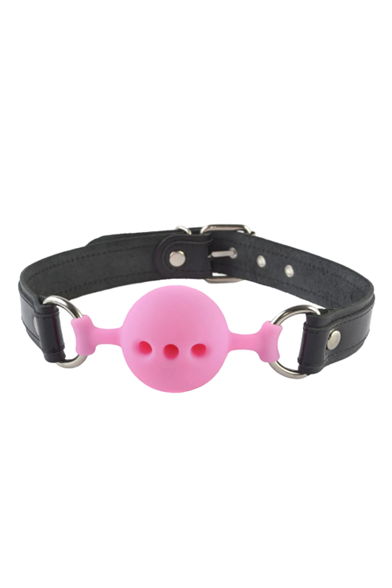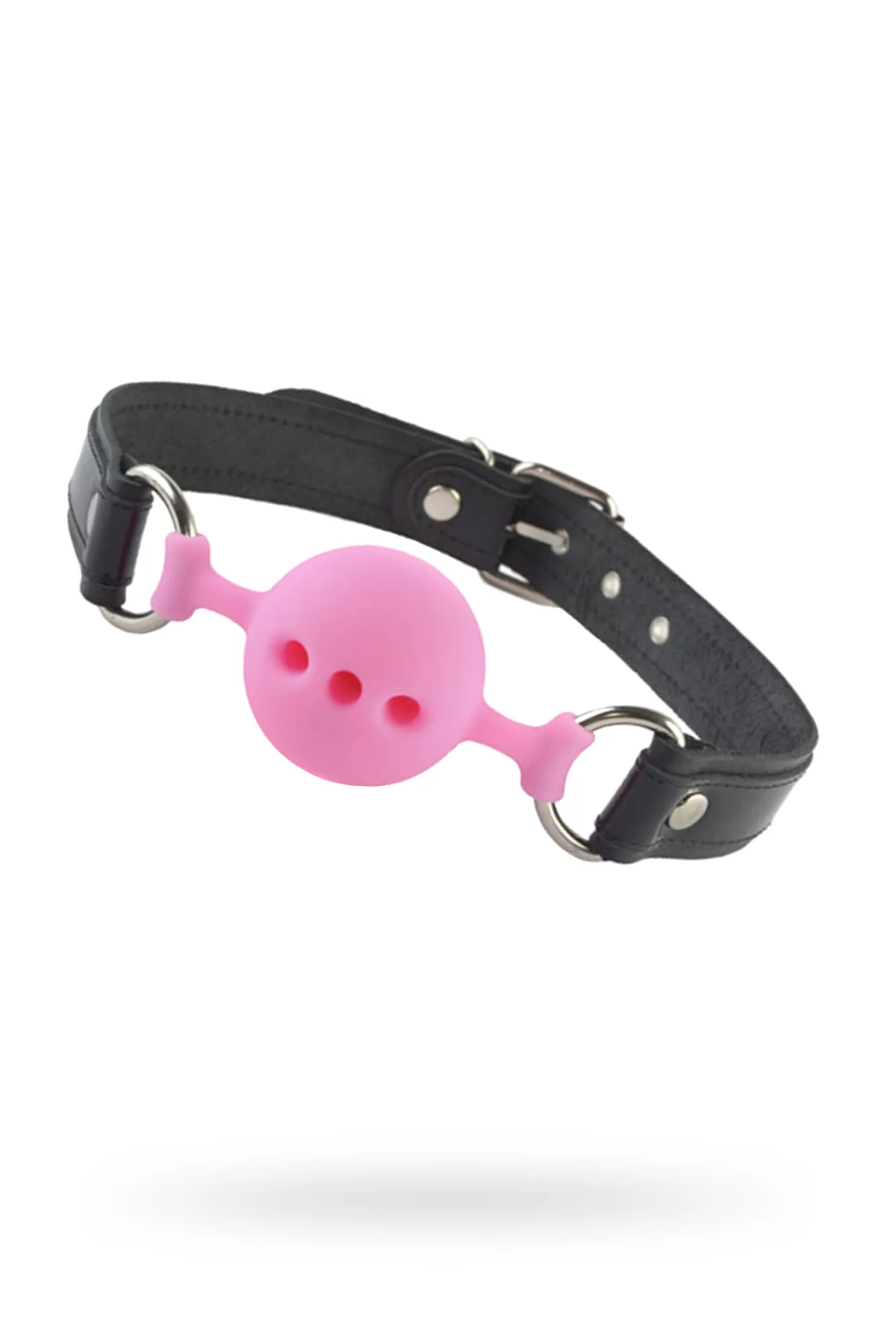 Кляп с оригинальным кожаным ремешком и лаковыми вставками черного цвета. Сам кляп-шар изготовлен из силикона, приятного на ощупь, со специальными отверстиями, пропускающими воздух.