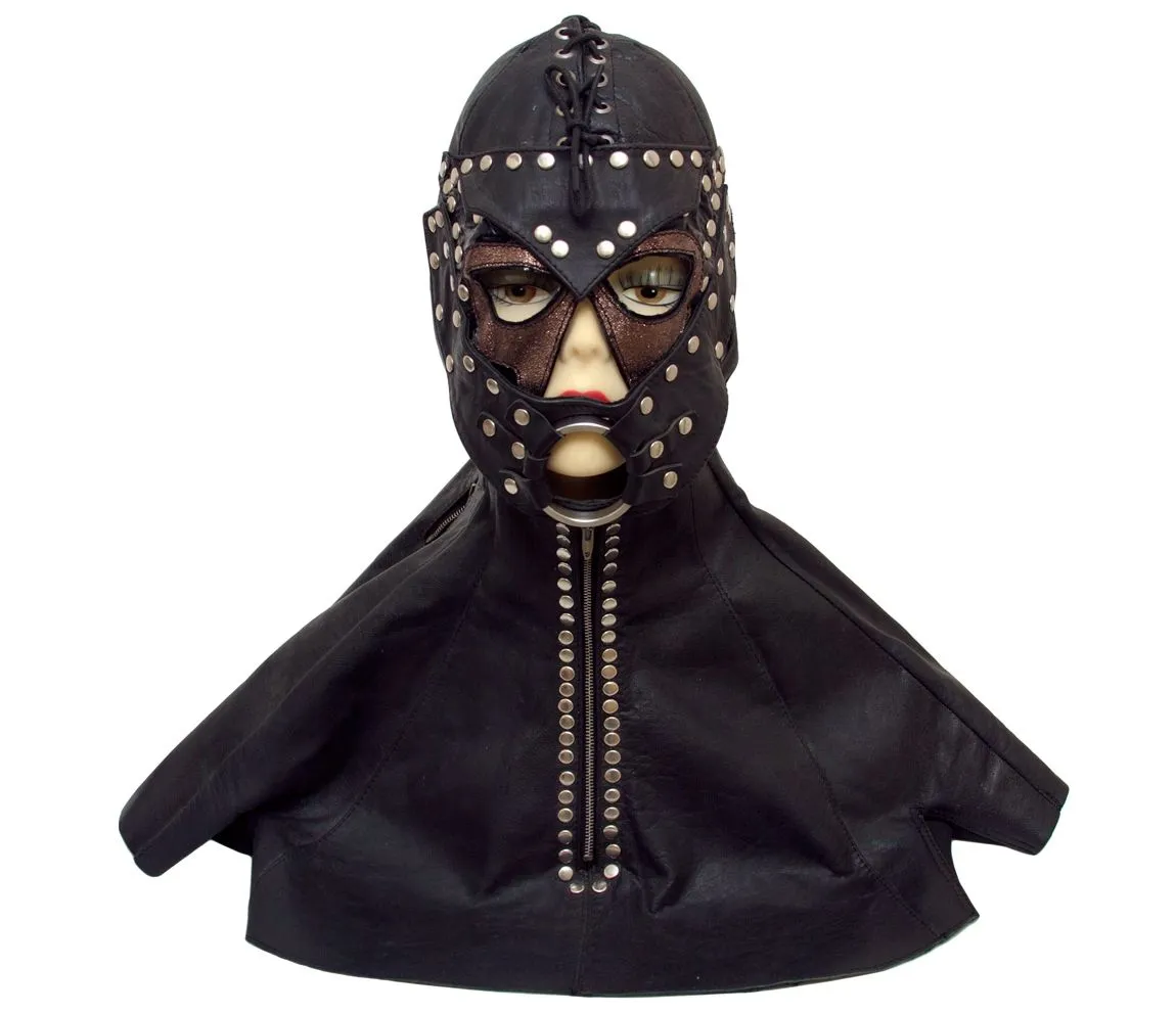 С этим необычным аксессуаром Вы сможете воплотить в жизнь все свои самые тайные фантазии, связанные с играми с элементами БДСМ! Шлем почти полностью скроет лицо Вашего партнера, а металлическое кольцо, выполняющее функцию расширителя, зафиксирует его рот в открытом положении. Партнер будет полностью в Вашей власти и сможет только стонать, еще более распаляя Ваше желание. Шлем выполнен из кожи черного цвета и богато декорирован металлическими клепками. Сверху есть удобная шнуровка, а сбоку и спереди он застегивается на молнии.