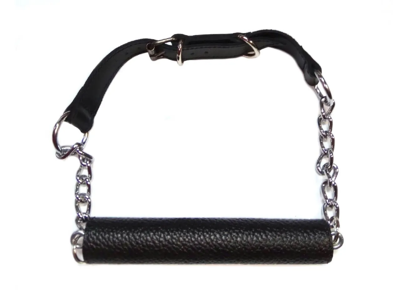 Трензель с цепями выполнен из натуральной кожи черного цвета. Ремешок регулируется по длине, поэтому его можно будет подогнать под нужный размер. Длина самого трензеля составляет 14 см.