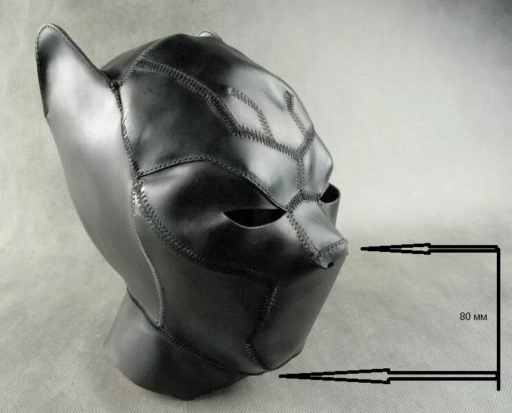 Женский шлем "Черная пантера" от бренда Beastly сделан из натуральной кожи черного цвета и оснащен длинной молнией на затылке. Он неподшитый и плотно садится на голову. У шлема есть прорези для глаз и только два небольших отверстия под носом, поэтому дыхание будет частично ограничено.