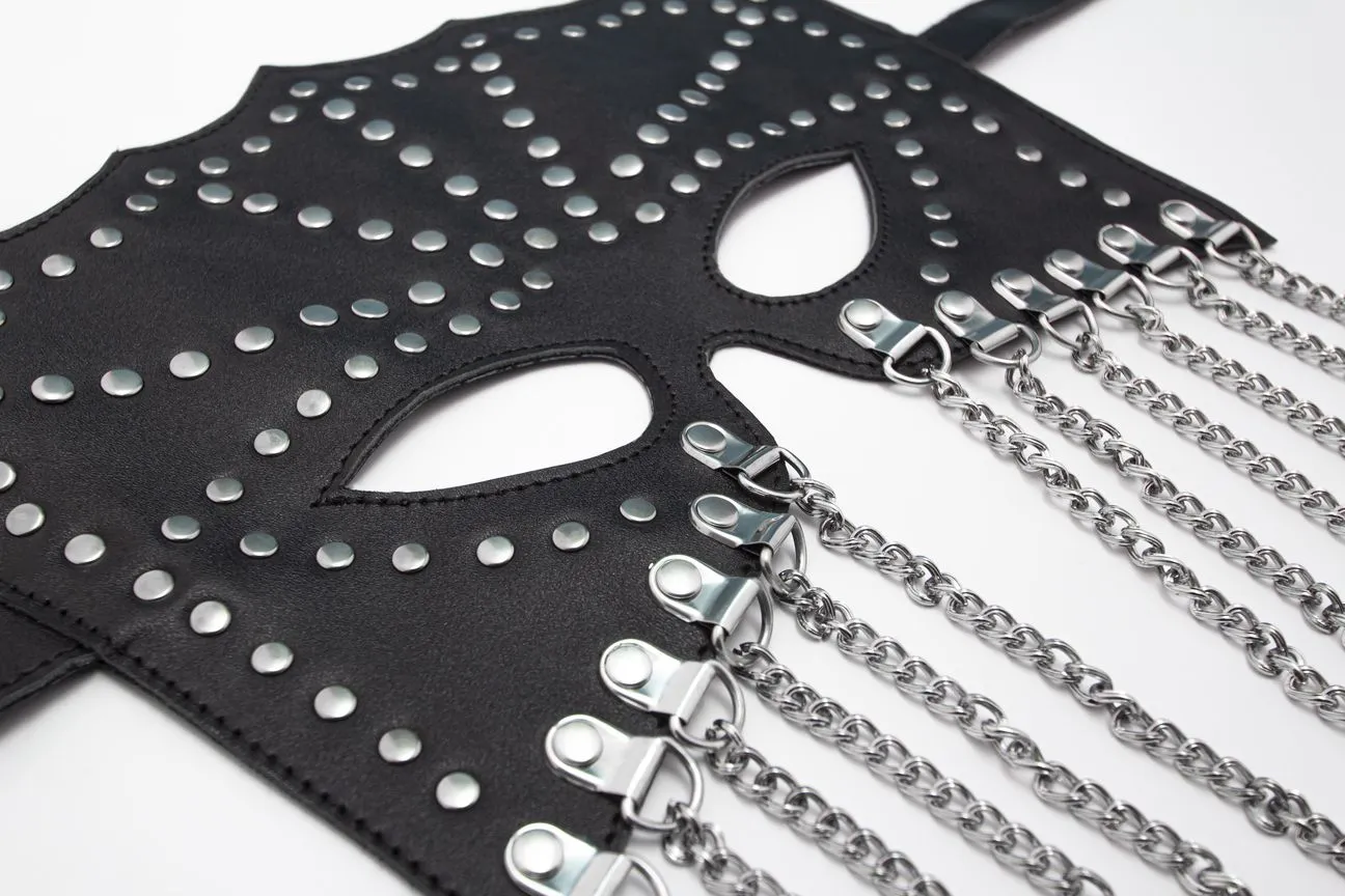 Маска изготовлена из натуральной кожи, украшена цепочками и металлическими заклепками. Маска плотно застегиваются с помощью ремешка с регулируемой пряжкой. Данное изделие станет прекрасным дополнением вашего образа в стиле БДСМ.