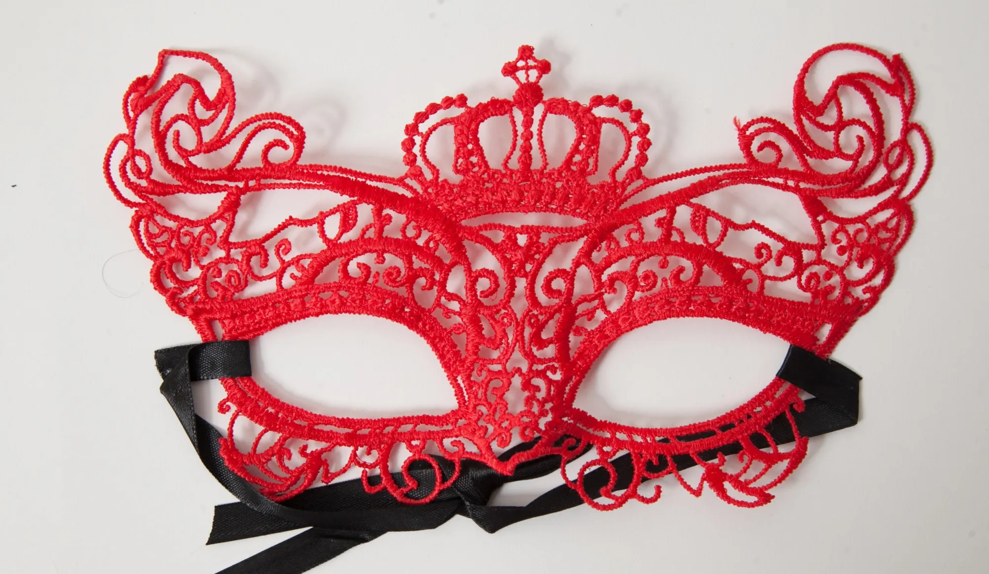 Красная кружевная маска в венецианском стиле с многочисленными ажурными узорами и короной по центру. Завязывается на атласные черные ленты. Размеры маски: длина- 21,5 см, ширина - 11,5 см. Упаковка- картонный конверт.