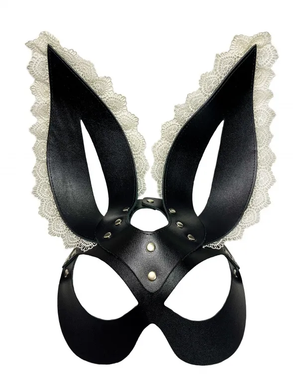 Супер-эффектная и сексуальная маска зайки. Выполнена маска из плотной черной кожи высокого качества, она отлично держит форму. Ушки декорированы красивым кружевом нежно-бежевого оттенка. Подойдет к любому типу лица, отлично подчекнув глаза. Ушки длинные, стоячие. Фиксируется маска на металлическую пряжку сзади. Этот аксессуар станет главной фишкой вашего образа, добавит сексуальности и игривого настроения!