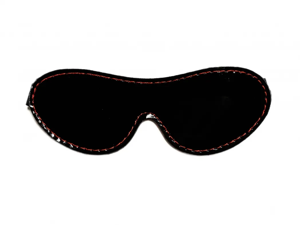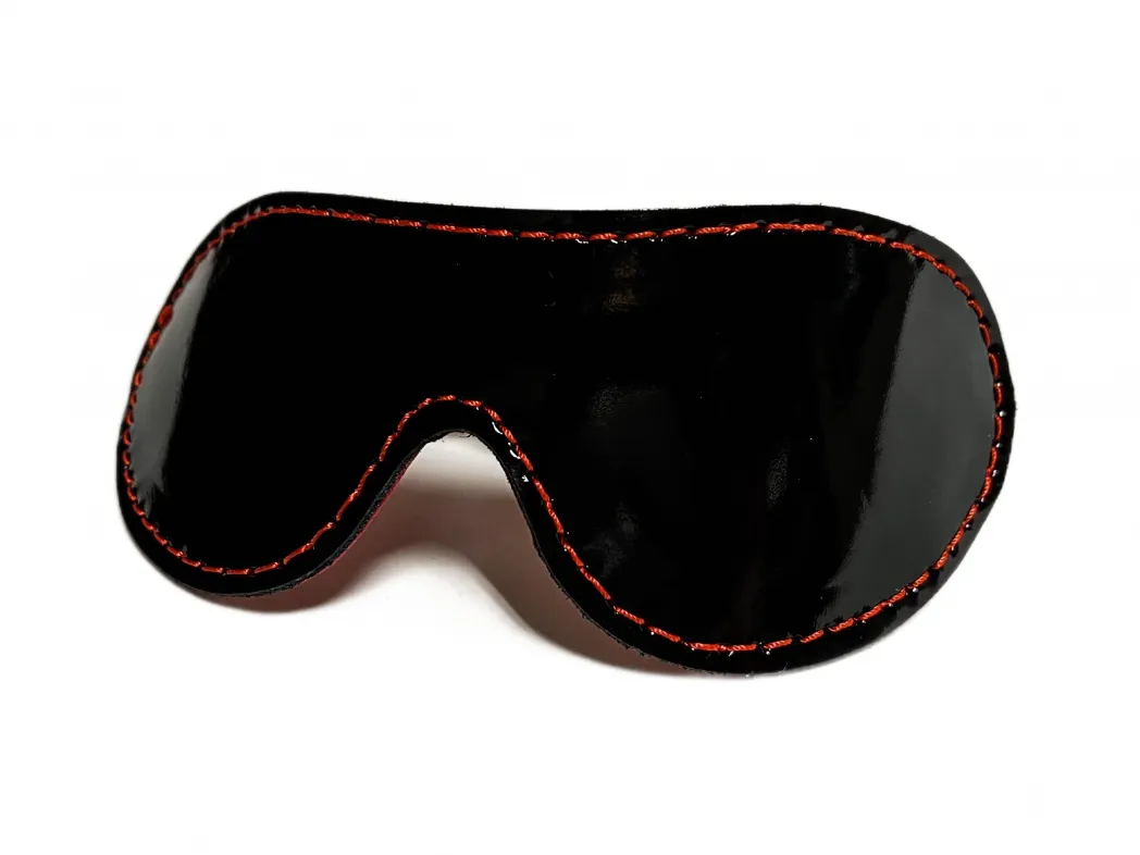 Маска из натуральной кожи на резинке. Можно испльзовать как двустороннюю: одна сторона  выполнена из лаковой кожи черного цвета, а вторая из красной перчаточной кожи,очень нежной и приятной к лицу. Декорирована маска контрастной красной строчкой. Благодаря эластичной резинке, размер универсальный, ширина резинки 2см.