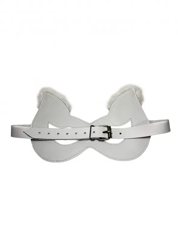 Игривая маска белого цвета, выполненная из натуральной кожи. Ушки маски украшены нежным белым эко-мехом, что придаёт ей изящности. Фиксируется сзади с помощью металлической пряжки, позволяя выбрать комфортный обхват головы. Форма макси эффектно подчеркивает глаза и создаёт необычный образ.