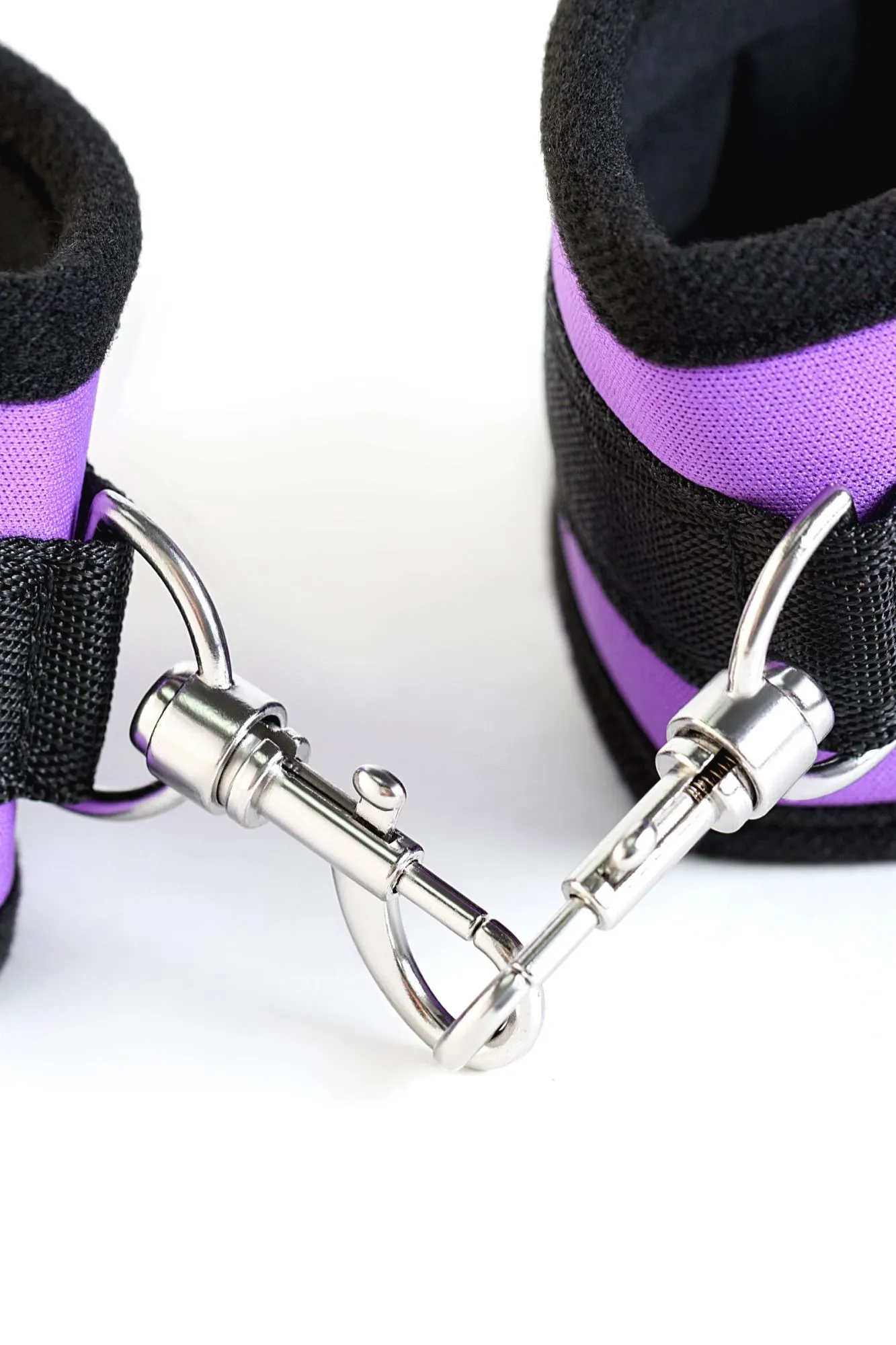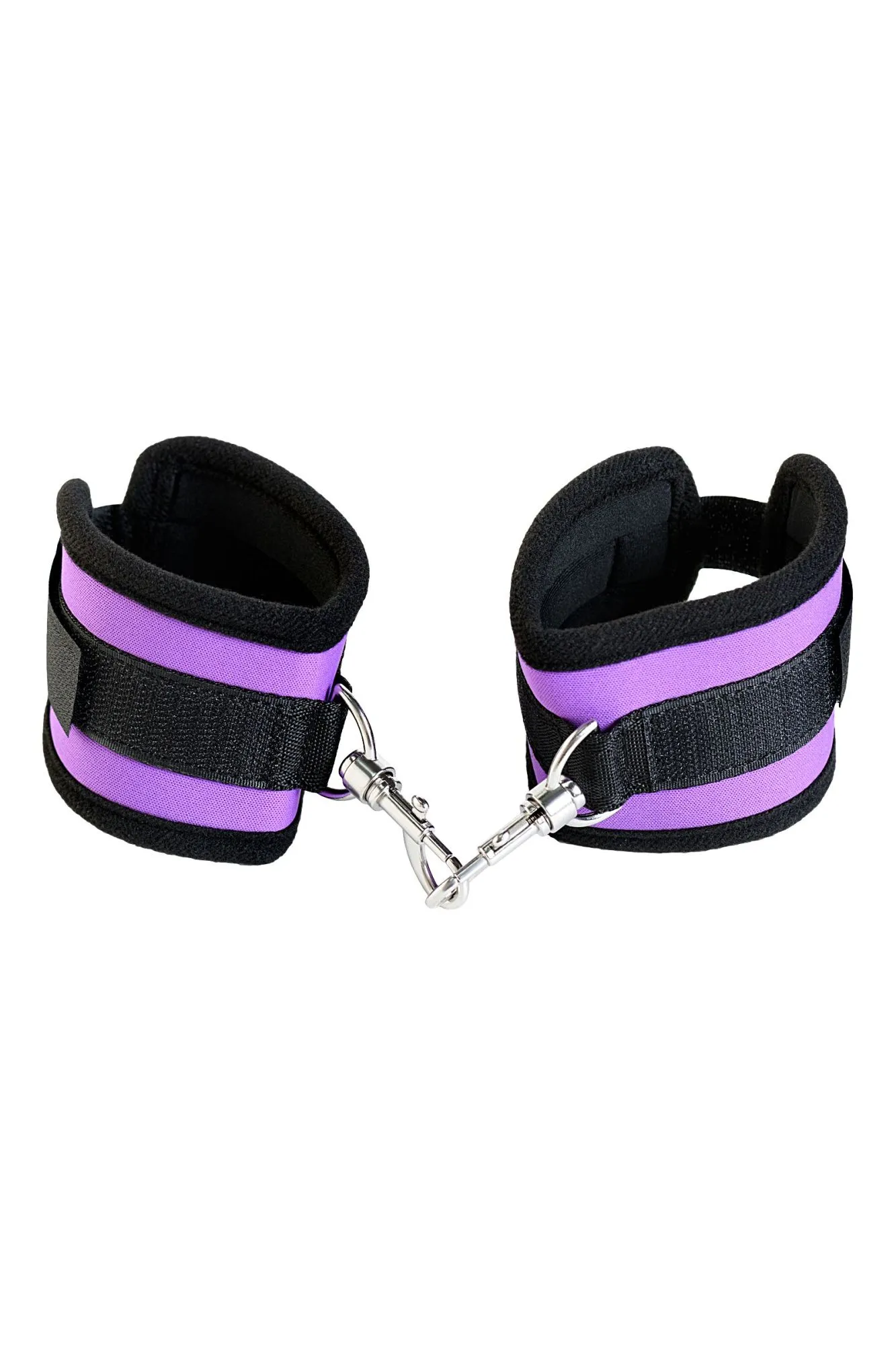 Наручники фиолетовые неопреновые. Мягкие манжеты с застежкой велкро, позволяющей максимально регулировать объем. Между собой наручники соединены карабинами.