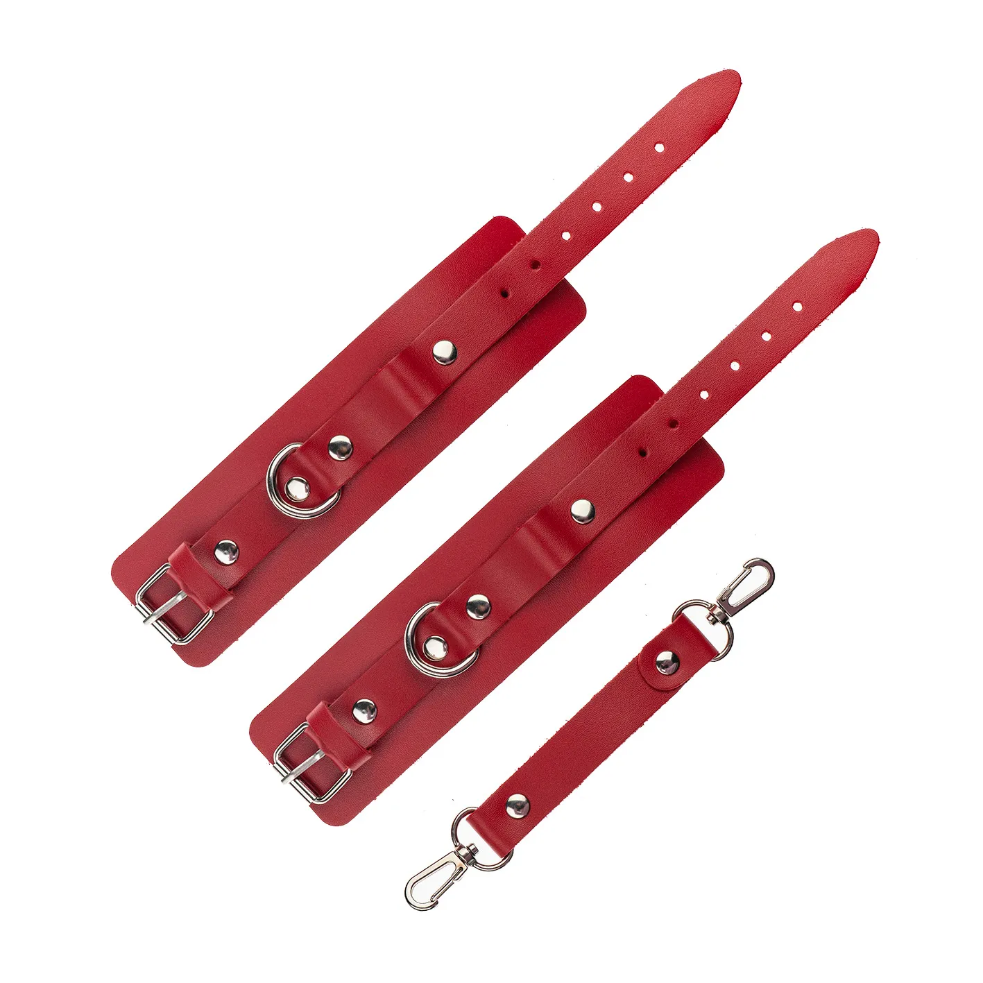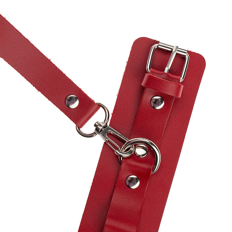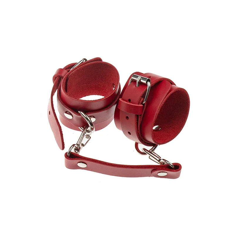 Теперь Доминант покажет, что значит грубое обращение и полный контроль над свободой. Красные наручники с металлической отделкой на самом деле твёрдо обхватывают руки и надежно соединяют их между собой коротким кожаным ремешком на карабинах. Предусмотрено место для крепления дополнительных аксессуаров. Можно придумывать разные варианты фиксации.