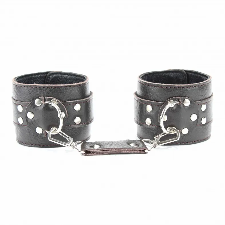 Кожаные наручники потрясающего коричневого цвета.Ширина - 6 см. Украшены заклепками и соединяются между собой цепью с карабинами (длина цепочки - 15см) Размер наручников регулируется при помощи застежки.