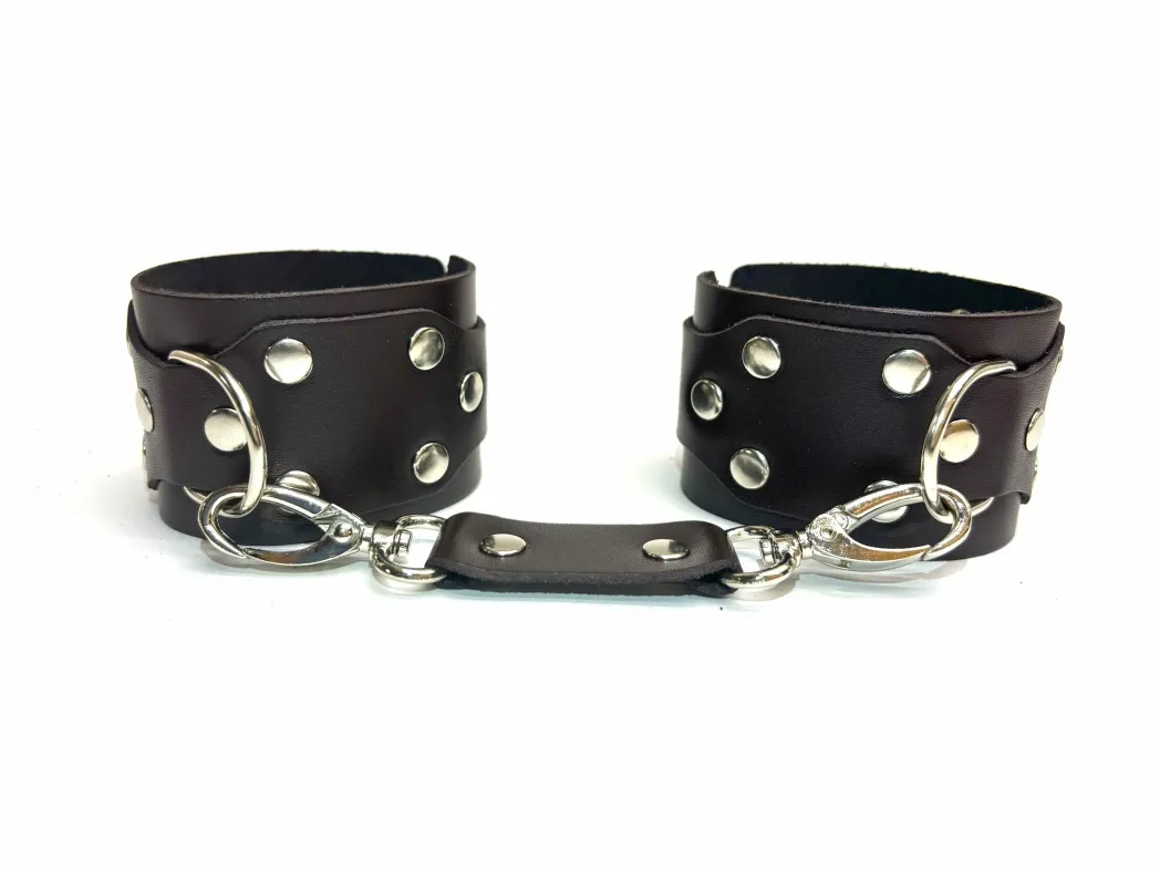 Эффектные и строгие наручники Sex Game, выполненные из плотной натуральной кожи в благородном тёмно-шоколадном оттенке. Аксессуар декорирован качественной металлической фурнитурой, регулировка происходит с помощью пряжек. Ширина наручников 5см, обхват регулируется от 16см до 24см. Эти наручники идеально сочетаются с другими аксессуарами из линейки Sex Game, их можно пристегивать к поясу, к гартерам или даже к поводку с ошейником, Ваша фантазия не ограничена. Отличный аксессуар для новых волнующих игр в Вашей спальне! В комплект к наручникам входит одно соединение на карабинах, дополнительные можно приобрести поштучно отдельно. Материал: натуральная кожа, металл