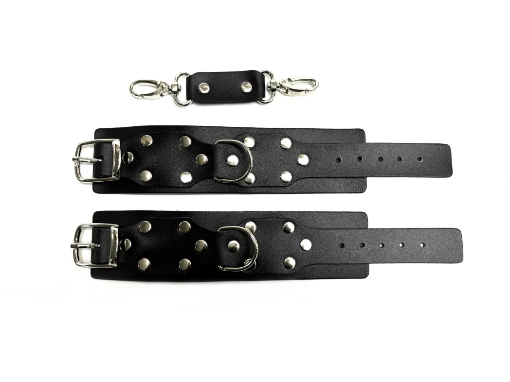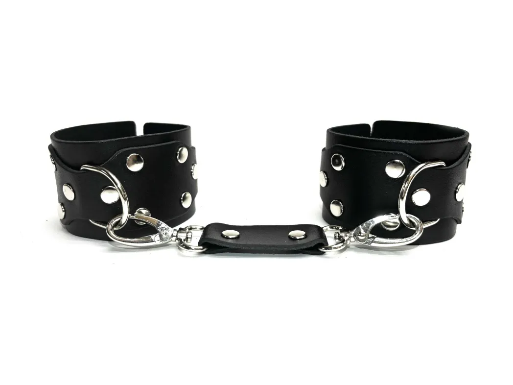 Эффектные и строгие наручники Sex Game, выполненные из плотной натуральной кожи в черном цвете. Аксессуар декорирован качественной металлической фурнитурой, регулировка происходит с помощью пряжек. Ширина наручников 5см, обхват регулируется от 16см до 24см. Эти наручники идеально сочетаются с другими аксессуарами из линейки Sex Game, их можно пристегивать к поясу, к гартерам или даже к поводку с ошейником, Ваша фантазия не ограничена. Отличный аксессуар для новых волнующих игр в Вашей спальне! В комплект к наручникам входит одно соединение на карабинах, дополнительные можно приобрести поштучно отдельно. Материал: натуральная кожа, металл