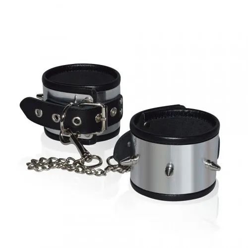 Оковы с декоративной отделкой под металл изготовлены из натуральной высококачественной кожи. Контрастное сочетание  черной кожи и имитирующей металл отделки, придаёт изделию жёсткости и эпатажности.  Дополняют девайс небольшие металлические шипы. Соединить  оковы между собой можно при помощи 15 см цепочки с карабинами на концах.  Вся металлическая фурнитура имеет никелевое покрытие.