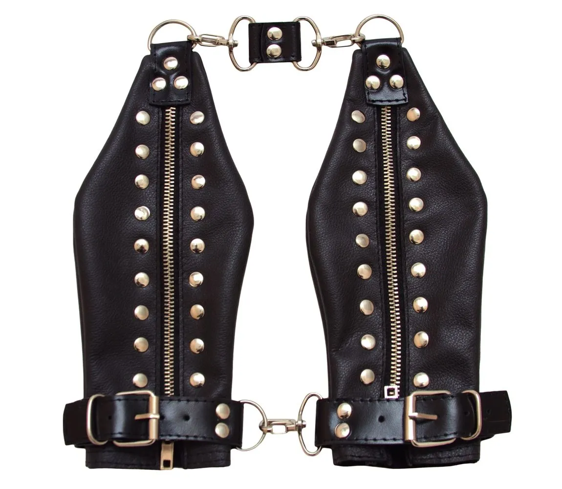 Наручники выполнены из кожи черного цвета с декором из металлических клепок и соединены между собой при помощи карабинов. Наручники застегиваются на молнию, их размер можно регулировать при помощи ремня с пряжкой.