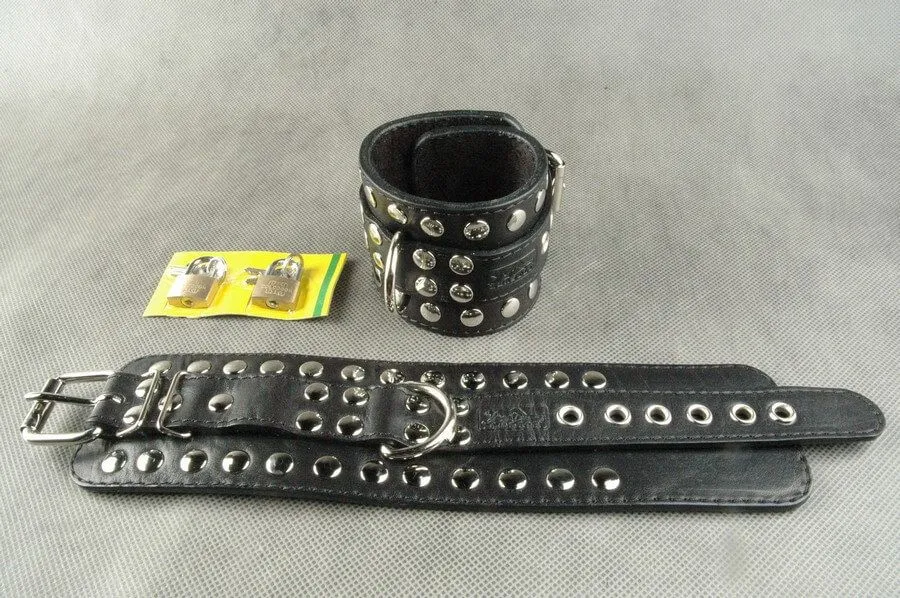 Наручники сделаны из натуральной кожи черного цвета, подшиты велюром и декорированы металлическими клепками по краю. Без соединительной фиксации. Регулируются по размеру.