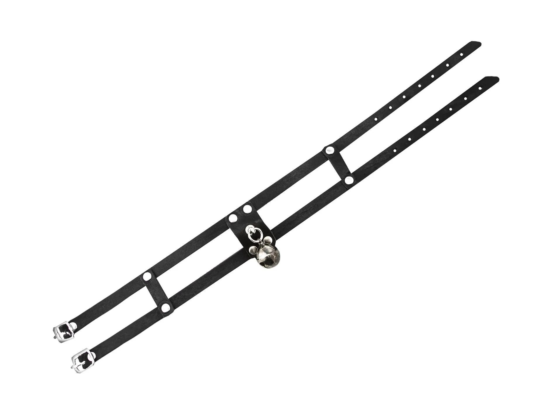 Ошейник из черной натуральной кожи черного цвета. Выполнен из двух тонких полос кожи и украшен колокольчиком. Две небольшие застежки - пряжки позволяют регулировать размер.