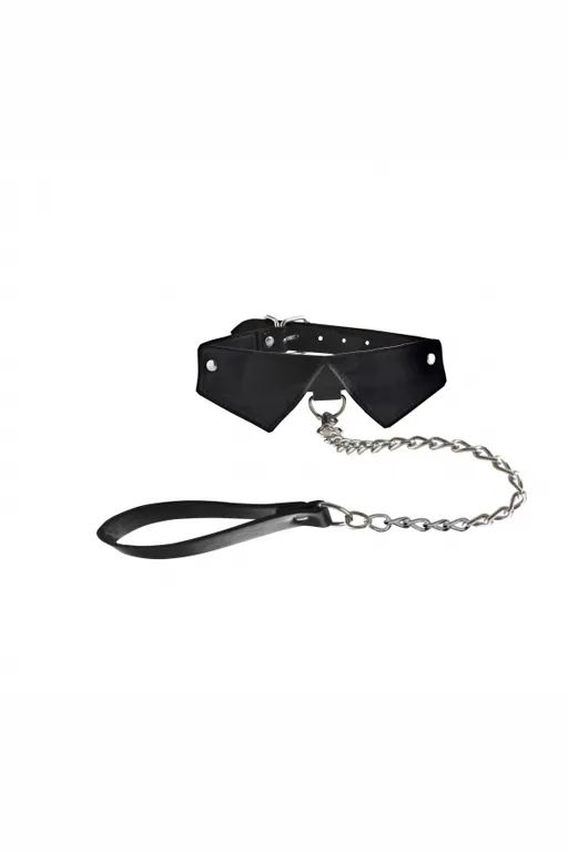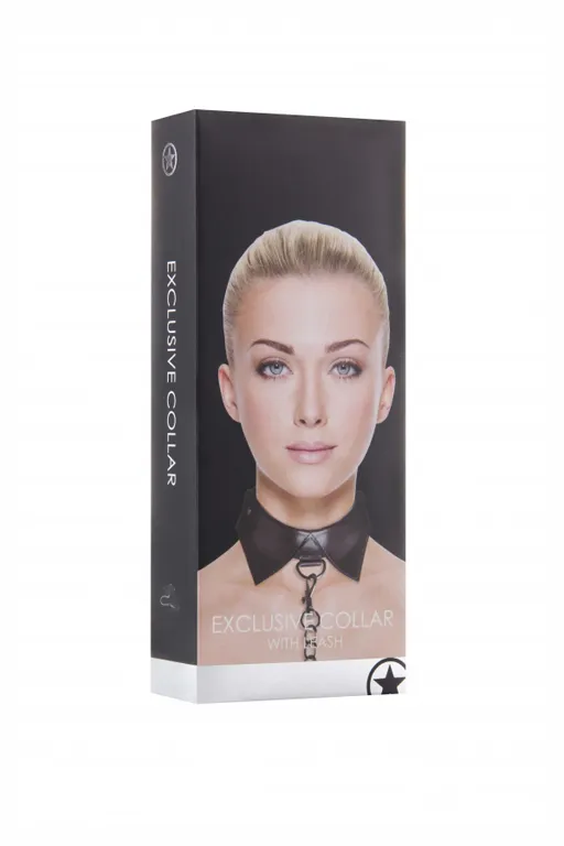 Эксклюзивный ошейник с поводоком Exclusive Collar & Leash - атрибут подчинения для эротических ролевых игр и практик БДСМ, выполненныей в виде воротничка. На внешней части внизу ошейника имеется небольшое D-образное колечко, за которое можно зацепить входящий в комплект поводок в виде металлической цепочки с фиксацией с помощью кожаной петли на запястье.