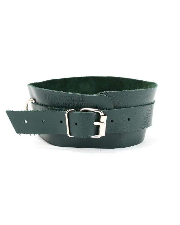 Ошейник сделан из мягкой натуральной кожи изумрудного цвета. Впереди высокая стойка декорирована металлическим кольцом, размер ошейника регулируется пряжкой сзади. Стильный  аксессуар разнообразит любую БДСМ игру!