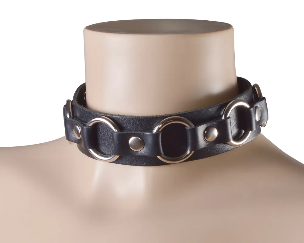 Ошейник изготовлен из натуральной кожи, декорирован шестью металлическими кольцам. Размер регулируется при помощи пряжки.