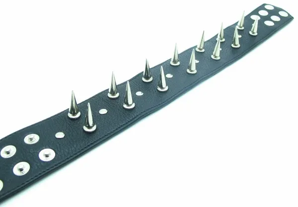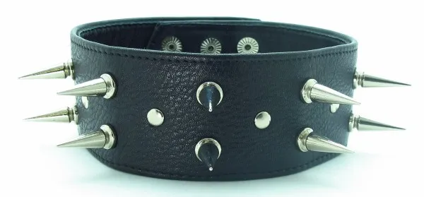 Один из основных атрибутов БДСМ. Ошейник изготовлен из натуральной кожи с мягкой подкладой. При изготовлении использована никелированная фурнитура. Ширина ошейника - 5 см,, длина шипов - 3 см
