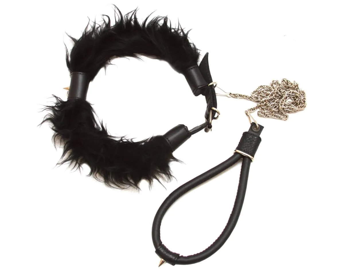 Ошейник выполнен из натуральной кожи черного цвета и мягкого искусственного меха. Также в комплекте есть поводок на цепочке, который пристегивается к кольцу на ошейнике при помощи карабина. Ошейник можно регулировать по размеру при помощи ремешка с пряжкой. А благодаря приятному на ощупь меху он не повредит нежную кожу шеи.