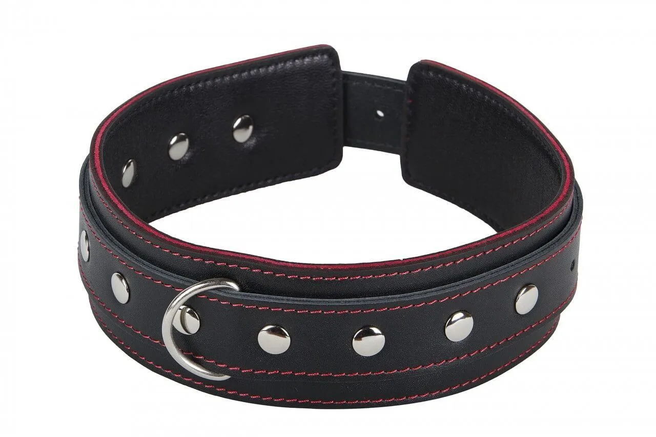 Ошейник от компании Fire Horse поможет Вам разнообразить свою интимную жизнь и добавить в нее немного остроты, вне зависимости от того, есть ли у Вас опыт в играх с элементами БДСМ. Он выполнен из натуральной кожи черного цвета и декорирован отстрочкой контрастного красного цвета. Также ошейник украшен металлическими заклепками, которые придают ему более эффектный вид.