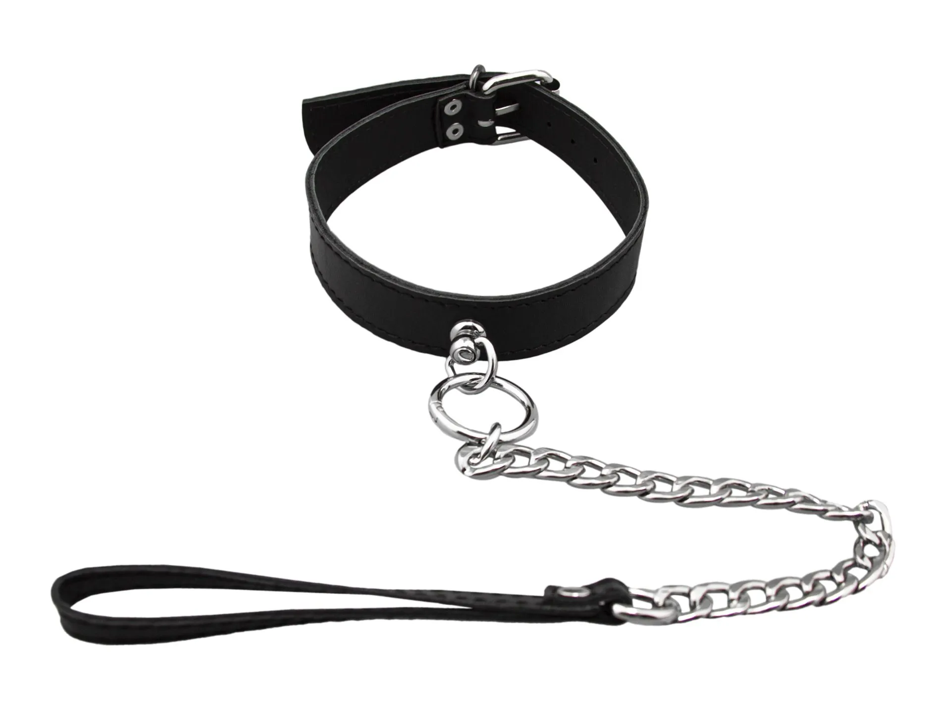 Этот ошейник понравится тем, кто предпочитает игры с элементами БДСМ. Ошейник выполнен из натуральной кожи черного цвета. У него есть металлический поводо, а также удобная петелька для запястья. При помощи поводка можно будет ограничить движения партнера, одергивать его при непослушании или направлять в нужную сторону. К большому металлическому кольцу на ошейнике можно также присоединять и другие аксессуары при помощи карабина. Такой ошейник может стать как просто дерзким украшением, так и символом подчинения своему партнеру.