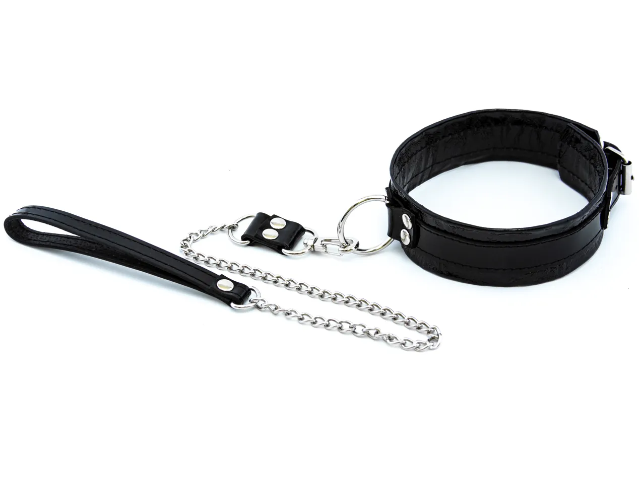 —Ошейник из черной лаковой кожи с поводком-цепью