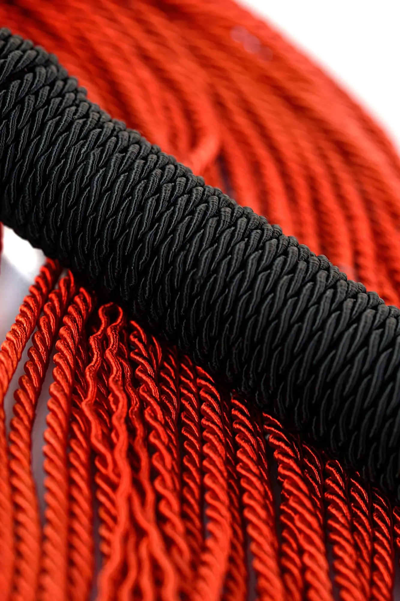 Веревочный флоггер с красными хвостами и черной плетеной ручкой мягко разогревает кожу и готовит к более серьезным воздействиям.
