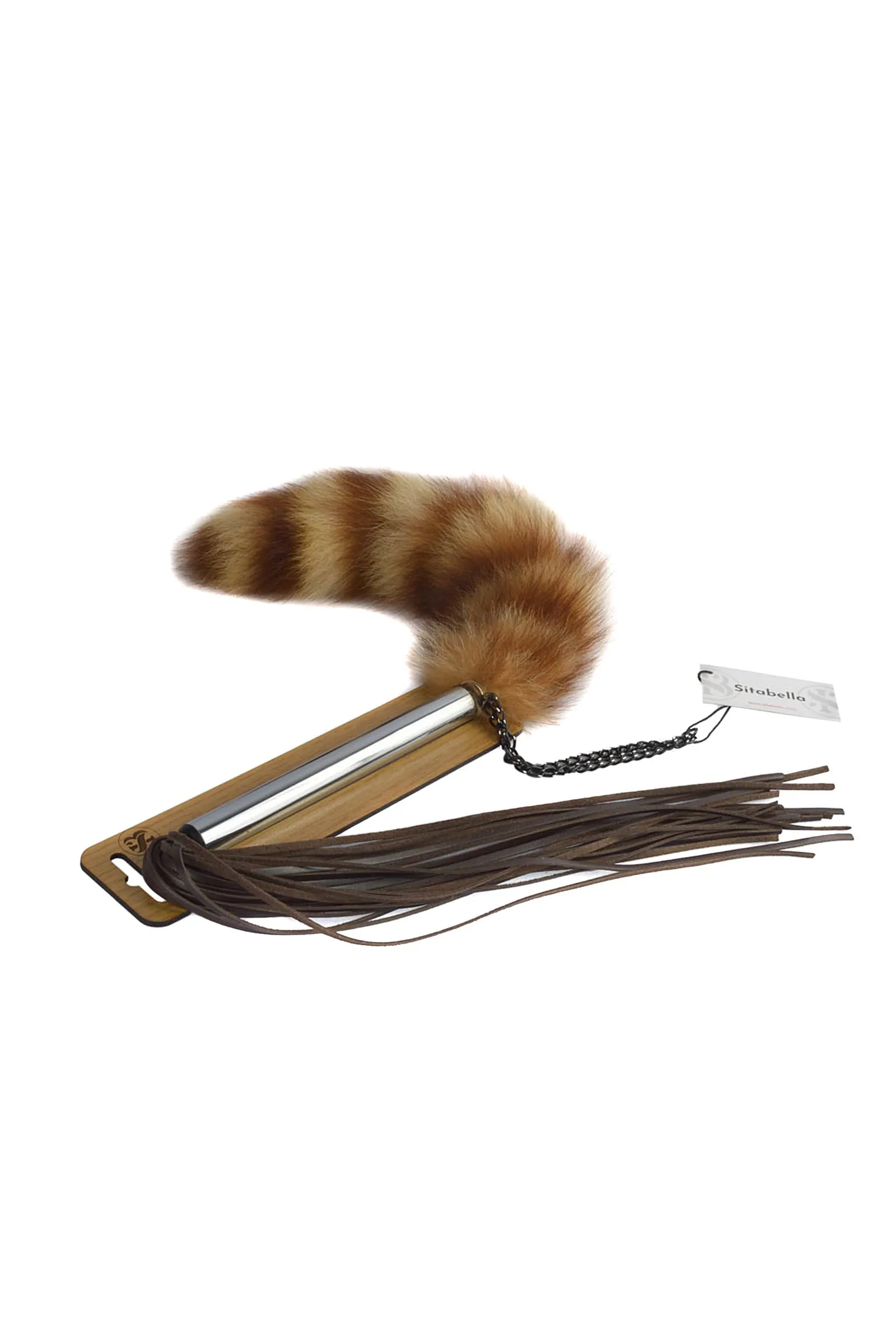Плеть-щекоталка с натуральным хвостиком и ударной частью из тонких 3-х мм лент коричневой натуральной кожи. Металлическая рукоять цилиндрической формы имеет диаметр 1,6 см, длину – 15 см. Длина ударной части 30 см, длина хвостика до 25 см.