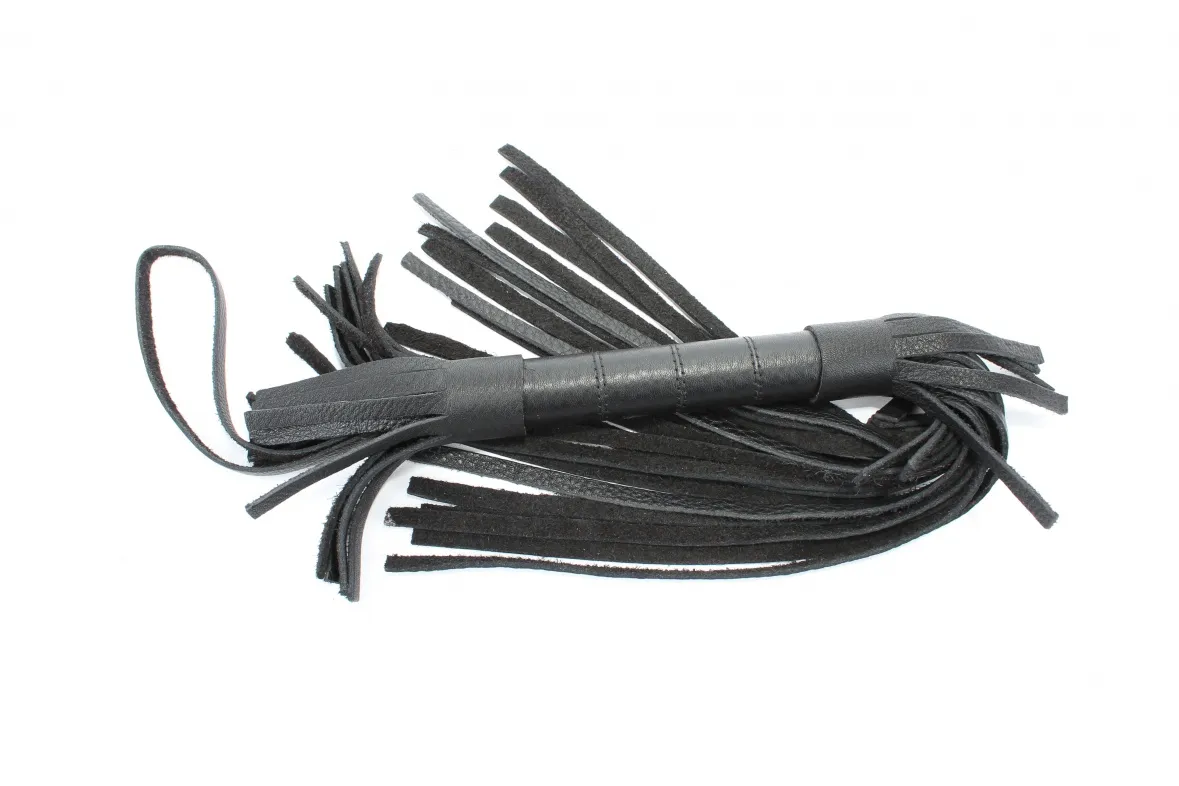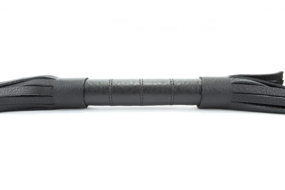 Аккуратная черная плетка, изготовленная из натуральной кожи. Имеет жесткую ручку длиной 18 см, так же покрытую кожей. Имеется петля для удобного использования плети. Длина хлыстов - 27 см. Общая длина плети - 51 см.