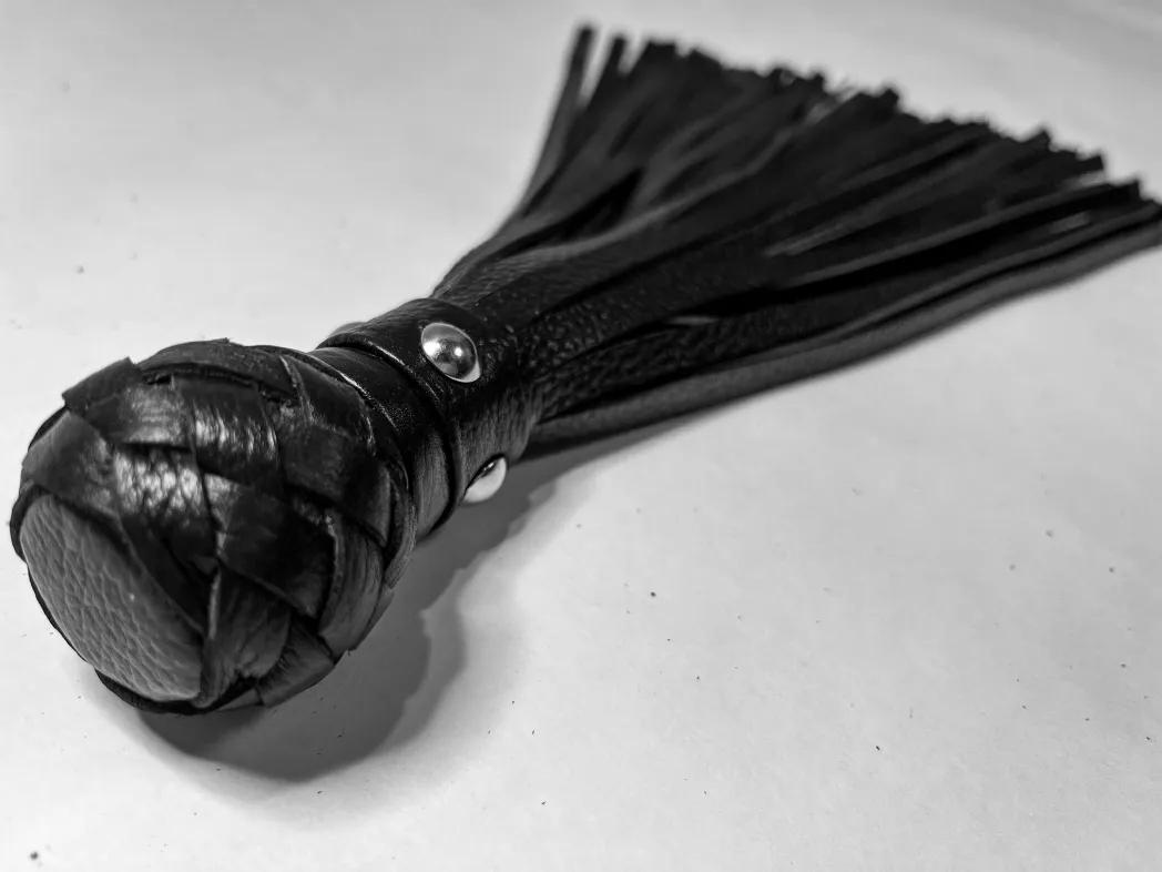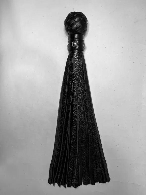 Изящная генитальная плеть, выполненная из натуральной кожи чёрного цвета. Мини-рукоятка декорирована плетением и металлической фурнитурой, очень комфортно ложится в руку! Общая длина аксессуара 30см. Плеть очень красивая, стоит только взять ее в руки, и уже не хочется отпускать. Эта малышка добавит огня и новых впечатлений в любовную игру!