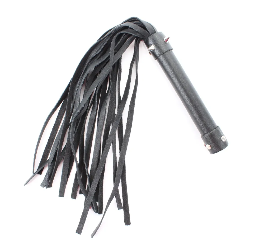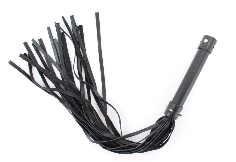 Плеть изготовлена из натуральной кожи, имеет 20 хвостов длиной 40 см. Хвосты имеют вид лент шириной 5 мм. Длина изделия-55 см. Украшена металлическими аксессуарами.