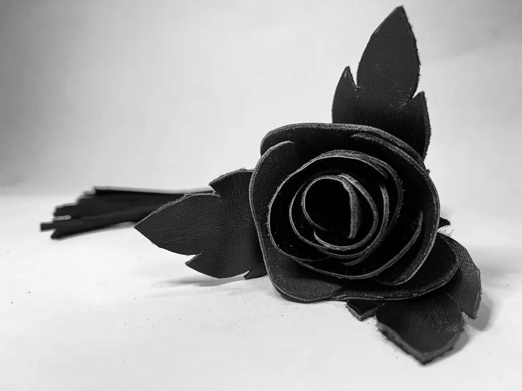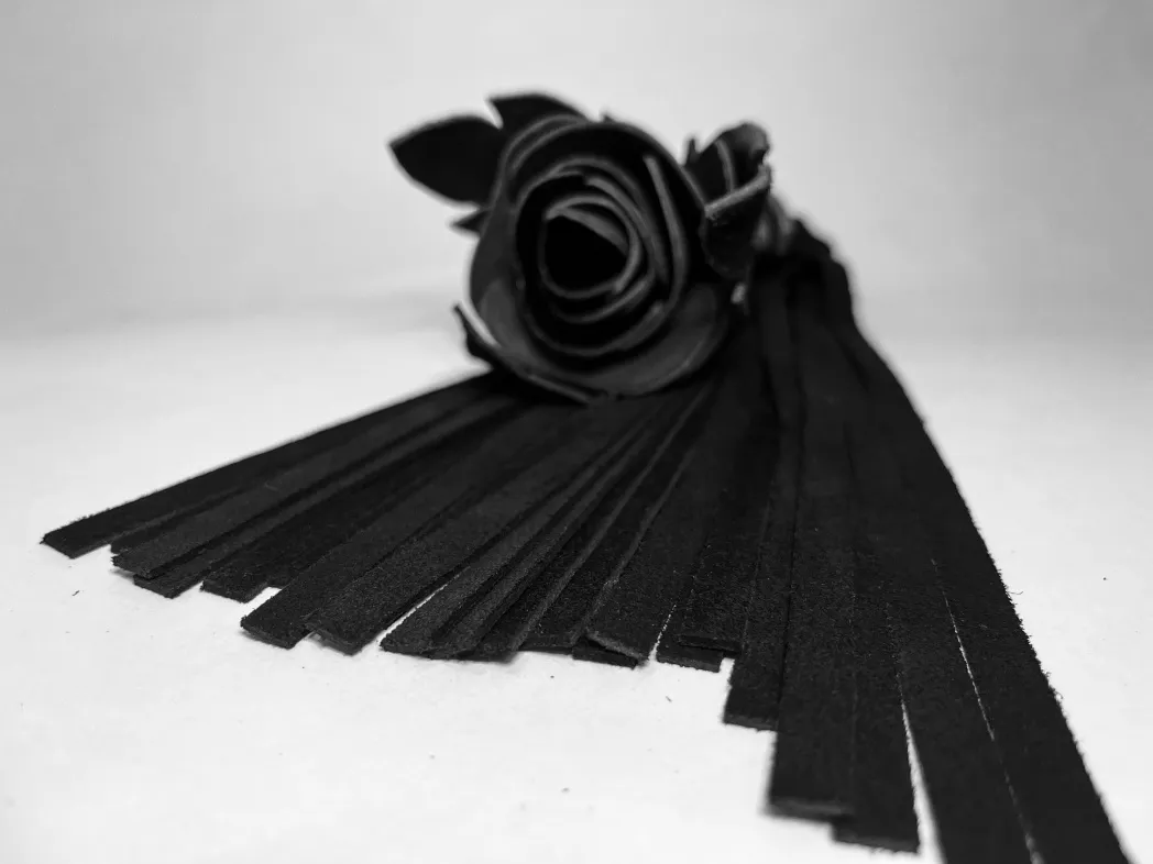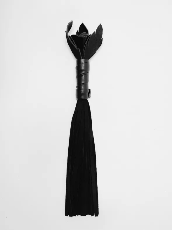 Восхитительная мини-плеть, украшенная чёрной розой. Цветок полностью выполнен из натуральной лаковой кожи, листочки розы и рукоятка выполнены из мягкой натуральной кожи, а хвосты плети-натуральная мягкая замша.Размеры этой плети очень изящны- общая длина всего 40см, поэтому данную плеть можно использовать, как генитальную, чтобы добавить новых ярких ощущений. Розочка очень удобно лежит в руке и создает неповторимую атмосферу и настроение, этот аксессуар никого не оставит равнодушным!