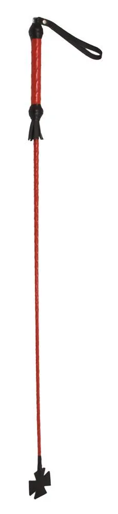 Стек длиной 70 см состоит из гибкой основы, овитой натуральной лаковой кожей красного цвета, наконечника в виде креста длиной 10 см и удобной рукояти с петлей для надевания на руку. Осторожно наносите удары, чтобы не повредить кожу узлом, с помощью которого наконечник крепится к телу стека.